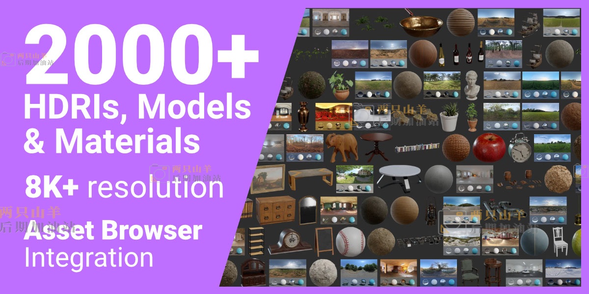 Poly Haven为Blender创建免费的高质量3D模型、材料和HDRI。包含超过1000模型、材质、HDRI预设,都是8K分辨率,直接调用即可。插件带来了所有hdri的材料,安装插件后,只需通过在您的首选项中创建一个新的资产库来选择您想要存储我们所有资产的文件夹。然后在资产浏览器中,您会找到一个按钮来获取我们所有资产的低分辨率版本。单击此按钮将下载大约 4GB,第一次可能需要几分钟。然后只需将资产拖放到您的场景中!资产被分组到左侧的目录中,因此您可以轻松过滤到您要查找的内容。标签也已加载,因此也可以随意尝试搜索!