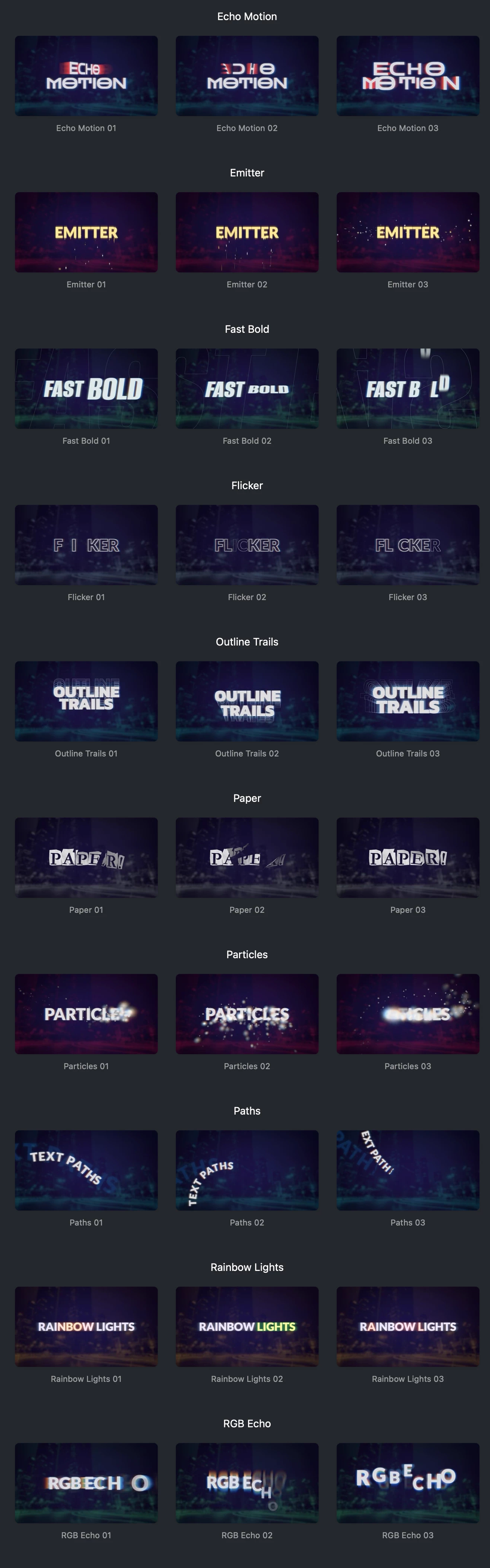如Echo Motion(动态残影)、Emitter(粒子发射器)、Fast Bold(大胆快速的大字动画)、Flicker(霓虹闪烁发光)、Outline Trails(多重描边拖影)、Paper(纸张剪影风格)、Particles(光点粒子与散景)、Paths(沿曲线运动)以及 Rainbow Lights / RGB Echo(彩色辉光与多色残影)等。