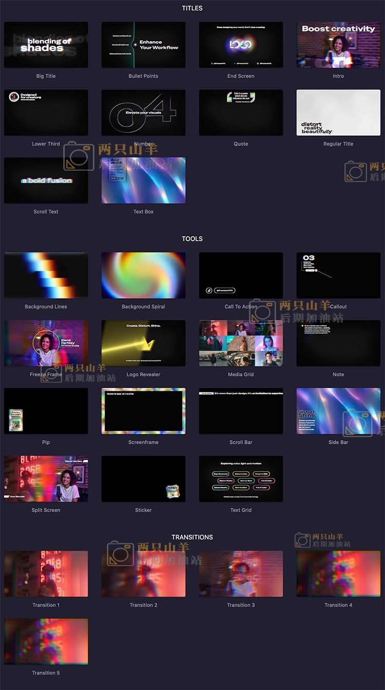 Chromatic Elements是一款专为现代视频编辑打造的创意特效工具包,灵感源自时尚的色谱设计美学。包含 10款动态标题、15种创意工具与5款无缝转场,轻松为影片注入活力、深度与视觉冲击力!无论是片头、引用字幕、滚动文本、标注、画中画布局,还是标志展示,每一款元素均设计精巧,能显著提升画面清晰度与叙事表现力。全系列支持高度自定义,拖拽即用,适用于品牌宣传、社交媒体、预告片及电影级项目,让作品瞬间脱颖而出!
